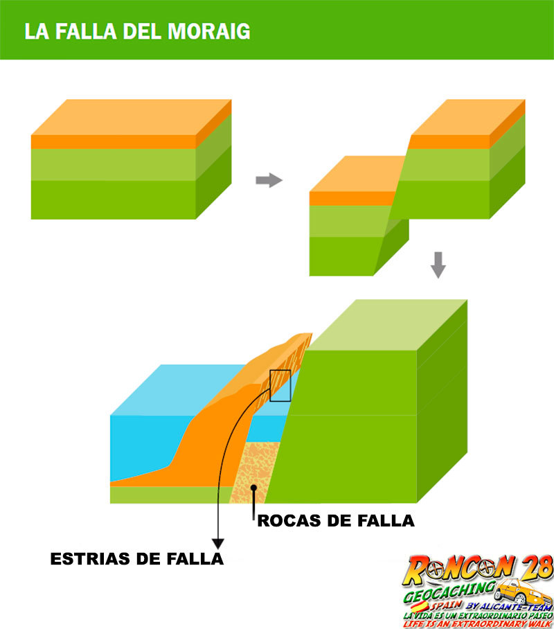 La falla del Moraig es un bello ejemplo de falla normal que discurre paralela a la cala del Moraig, pasa por la Cova dels Arcs y llega hasta el mar. Estas fallas presentan un típico relieve escalonado que es responsable, por una parte, de la morfología acantilada y, por otra, de que el mar aumente rápidamente de profundidad en este sector de la costa. Unos 150 metros antes de llegar a a la cala del Moraig, se encuentra a la derecha el sendero que conduce hasta una barandilla de madera, situada al borde de una sima, desde la que se puede observar de cerca una superficie de falla perteneciente a la falla del Moraig. Se trata de una espectacular pared rocosa estriada, casi vertical. La apariencia pulida de la pared rocosa y las estrías formadas por la fricción de los bloques indican la dirección de desplazamiento geológico que la originó. La falla parece suspenderse en el aire sobre una laguna, que en su interior alberga la entrada subacuática a una surgencia.