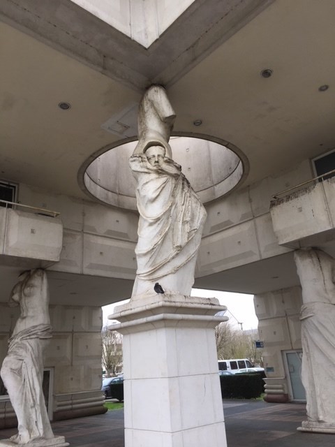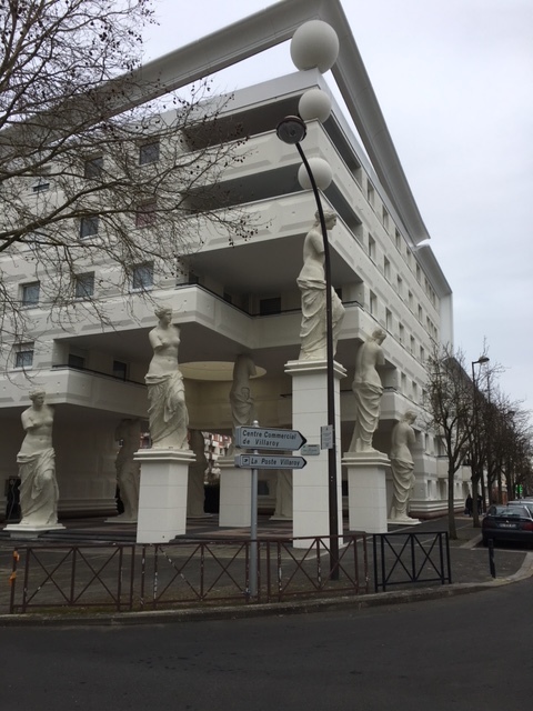 [EN] Gogottes Square is surrounded by 2 remarkable buildings with their great Caryatids. A Caryatid is woman sculpture bearing an entablature on her head, replacing then a column or a pillar. At Guyancourt, Spanish architect Manolo Nunez-Yanowsky, Ricardo Bofill’s follower, created this caryatid set with molded concrete to uphold the corners of the 2 buildings. They look like enlarged Victories of Samothrace. One of the buildings is at the crossing of Andréa Palladio and Franck-Lloyd Wright streets, 2 famous architects!
