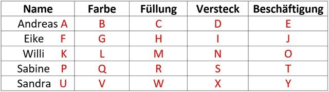 Findet anhand der Tipps heraus, welches Osterei mit welcher Füllung bei wem an welchem Ort versteckt wurde und womit jeder Rätselfreund zum Zeitpunkt des Versteckens beschäftigt war.