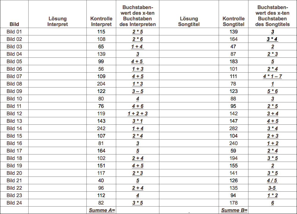 Zur eurer Kontrolle ist der Buchstabenwortwert des Songtitels bzw. des Interpreten/Band mit angegeben.