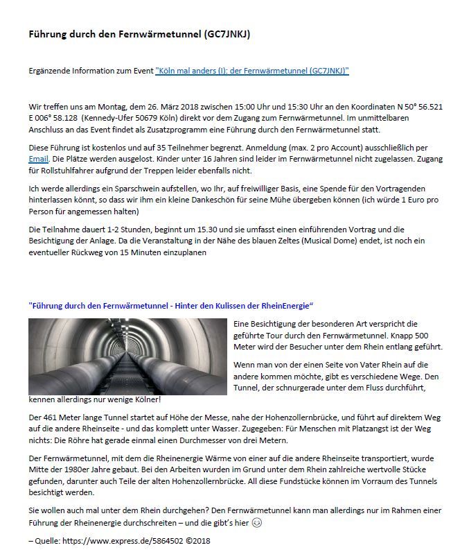 Das Event "Köln mal anders (I): der Fernwärmetunnel" findet am Montag, dem 26. März 2018 zwischen 15:00 Uhr und 15:30 Uhr statt.