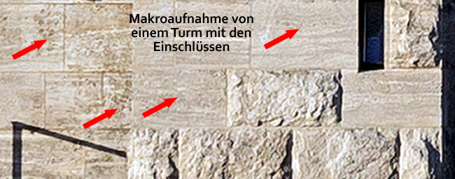 Entlang des Gebäudes ist das Gefüge der Sedimentgesteine mit seinen darin enthaltenen Fossilien mehr oder weniger deutlich erkennbar.
