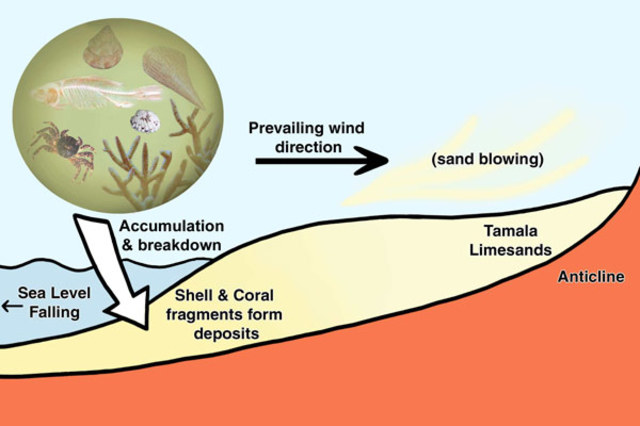 “Sedimentary rocks are types of rock that are formed by the deposition and subsequent cementation of that material at the Earth’s surface and within bodies of water. Sedimentation is the collective name for processes that cause mineral and/or organic particles (detritus) to settle in place. The particles that form a sedimentary rock by accumulating are called sediment. Before being deposited, the sediment was formed by weathering and erosion from the source area, and then transported to the place of deposition by water, wind, ice, mass movement or glaciers, which are called agents of denudation.”