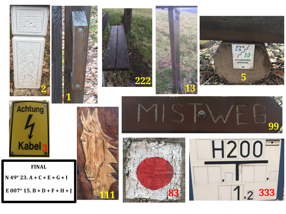 Unterwegs gilt es an den 10 Stationen A-J die jeweilige Zahl des passenden Bildausschnitts zuzuordnen. Bis auf an Station 8 muss der Wanderweg dabei nicht verlassen werden - und dort auch nur um ein paar Meter. Der Cache ist dann zu finden bei