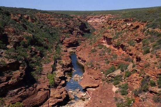 | The gorge below you forms the middle part of the "Z-bend" - a distinctive zig-zag section of the Murchison River. This unusual shape is formed by joints (fractures) whitin the red Tumblagooda Sandstone. |