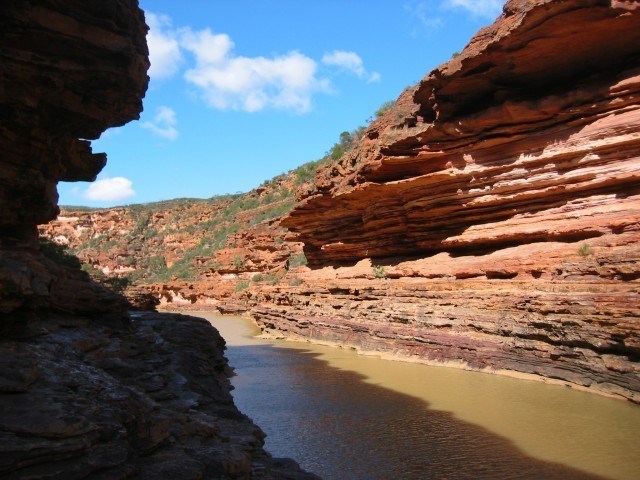 | These straight, vertical joints allowed the Murchison River to deeply incise the rock layers and form straight river segments. Where the joints intersect each other, the river's course changed to create a zig-zag pattern - the 'Z Bend' shape. |