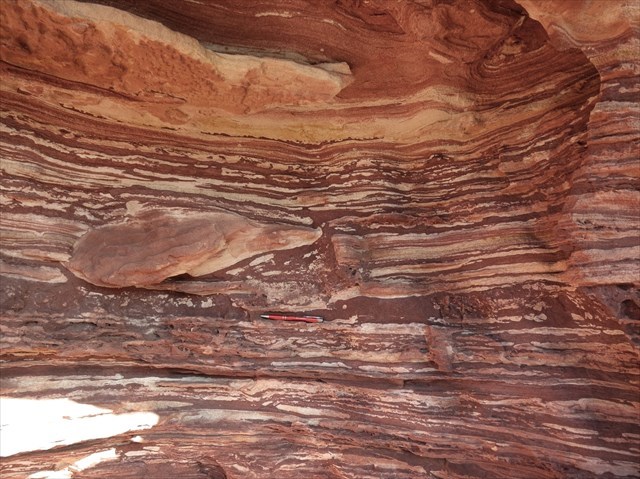 | Only one body fossil has been found so far in the Tumblagooda Sandstone — an impression of a strange arthropod called Kalbarria, which belongs to a now-extinct group called the euthycarcinoids. Body fossils are rare in the sandstone because the depositional environment was not favourable for the preservation of organic material. This is because the active, high-energy river system would have quickly broken down any carcasses, and the water’s high oxygen level would have rapidly decayed flesh. Despite this, the sandstones are rich in signs of life, preserving abundant tracks, traces and burrows of organisms that lived while the sandstone was being deposited. These ichnofossils give us an insight into not only what organisms were present while the sandstone was forming, but also what the environment was like |
