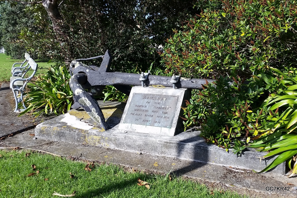Dug out of the sand by local farmer Arthur Gibson in 1969 , the anchor of the barque Harriet, wrecked at the mouth of the Ōkahu Stream south of Rāhotu in 1834, is now mounted outside the Rāhotu Hotel.