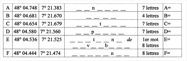 Finale : Nord: 48° 04. [(B/(C-D)] x A et Est: 07° 21. [(F - E) x B] + A