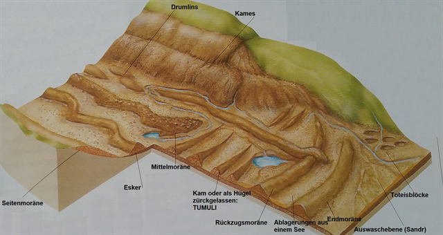 Moränen verschiedener Typen wurden ungeordnet abgelagert. Die Tumuli müsst Ihr Euch als Hügel vorstellen: