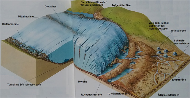 Somit gibt es das Grundmoränengeschiebe, dass sich unter dem wandernden Eis ablagerte und der Obermoränenschutt, der an der Oberseite des Gletschers liegen bleibt, wenn er schmilzt.