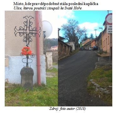 O místě, kde byla kaplička vystavěna také pouze spekulujeme, ale vycházíme ze skutečnosti, že je v historických paramenech (MALÝ, 1911) uváděno, že se první kaple od Svaté Hory nacházela na jejím úpatí, takže můžeme předpokládat, že kaplička stála kdysi v místě dnes stojícícho křížku, neboť od tohoto místa již stoupá strmá cesta „Svatohorskou alejí“ k vrcholkům poutního místa Svaté Hoře.