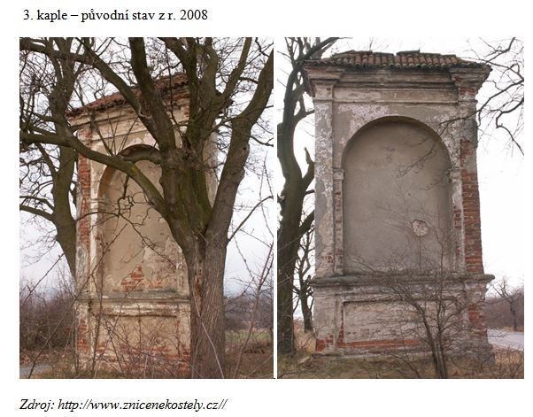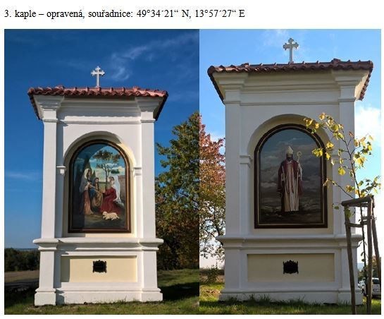 3. kaple – Stojí v katastru Březnice. Vystavěli ji březničtí radní páni, původně byla na kapli zobrazena jednotlivá zastavení modlitby I. růžence radostného – Navštívení Panny Marie, kaple byla r. 1880 opravena děkanem P. Petrželkou, v roce 2014 namaloval z jedné strany nový obraz Lubomír Pešek a druhý tentýž autor roku 2017 (nepodařilo se zjistit, jaká vyobrazení byla na severní straně kaple, proto byly zvoleny obrazy světců), (Nadační fond pro Březnici 2017).