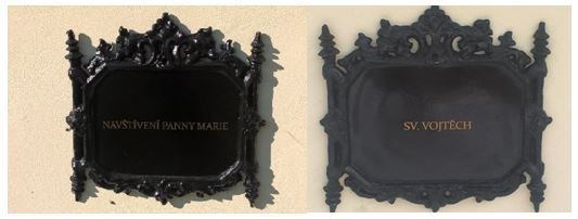Na vyobrazení je sedící postava sv. Alžběta (vdaná, proto má zahalenou tvář), beránek (atribut sv. Jana Křtitele, kterého čeká sv. Alžběta), klečící Panna Marie (v požehnaném stavu), (Nadační fond pro Březnici 2017).