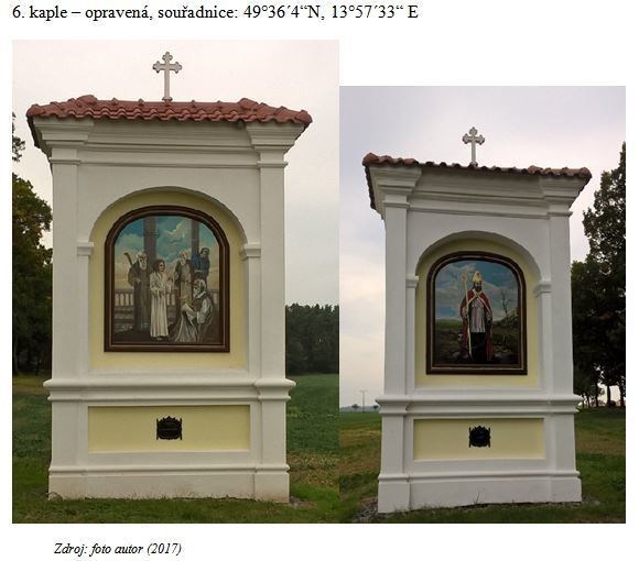 6. kaple – Stojí v katastru Chrást (za obcí Chrást). Vystavěl ji Jakub Bohutínský a Jan Zelený, březničtí měšťané, původně byla na kapli zobrazena jednotlivá zastavení modlitby I. růžence radostného – (dvanáctiletý Ježíš v chrámě) Nalezení Páně v chrámu, v roce 2015 namaloval z jedné strany nový obraz Lubomír Pešek a druhý (tentýž autor) roku 2017 (nepodařilo se zjistit, jaká vyobrazení byla na severní straně kaple, proto byly zvoleny obrazy světců), (Nadační fond pro Březnici 2017).