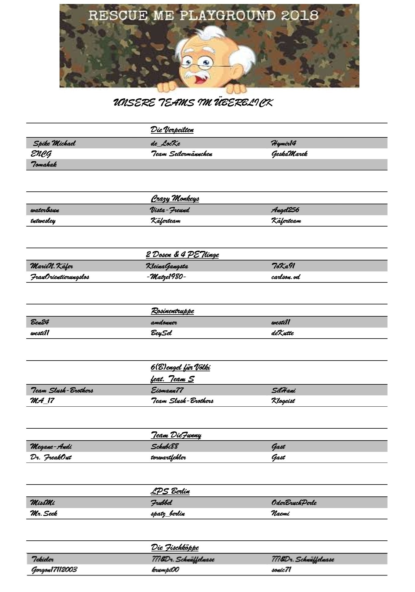 Teilt uns in eurem WA-Log mit, ob ihr am Playground starten möchtet bzw. mit wem ihr zusammen im Team sein wollt und wie das Team heißen soll. Doch keine Bange, falls ihr die 6 Personen nicht voll bekommen solltet: Genau wie in den letzten Jahren werden wir euch dann aufteilen. Innerhalb der nächsten 48h bekommt ihr von uns eine Nachricht zugeschickt. Nachdem wir das Startgeld erhalten haben, werden wir euch im Listing als Teilnehmer vermerken.