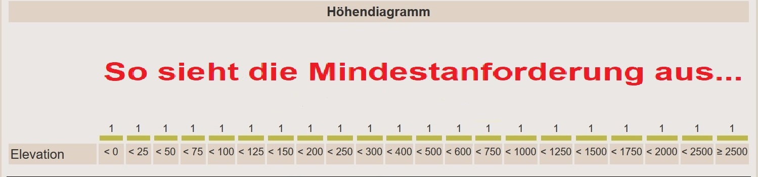 Da meine andere Challenge vielleicht doch etwas heftig ist, gibt es hiermit noch eine "Light-Version". Zur Erfüllung sind nur 21 Funde erforderlich und zwar in jedem Höhenbereich mindestens einer. Das wars. ;-)