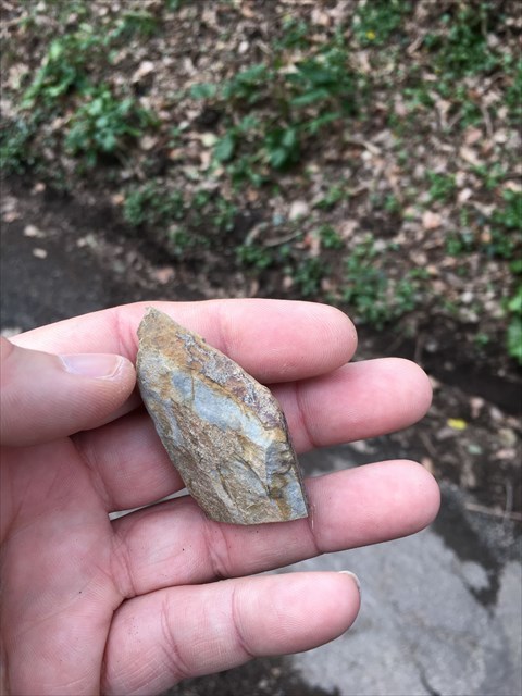 Question 3 : Sur la photo suivante, vous voyez un petit caillou provenant de cet affleurement. Pouvez-vous trouver le même type de roche et en dire plus sur sa texture ? Est-il rugueux, lisse, cassant, dur, coupant, ... et à votre avis de quelle pierre s'agit-il ?