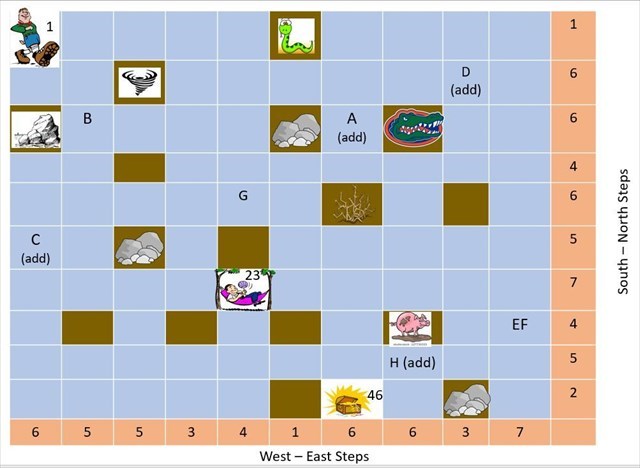 Happy Hoagies Hiker (starting at step 1) is only allowed 46 total steps through the swamp to reach the hidden cache. The picture below shows the areas he can travel through without stepping into the mud sinkholes or other obstacles shown by the brown squares. Each square represents 1 step. Hoagies can only travel horizontally or vertically across the squares on the picture below. There is a resting point shown on the map at Step #23. The numbers on the pink margins show how many steps are allowed (and must be taken) in the corresponding row or column, including the steps that are already numbered on the picture. You need to figure out his trail to the cache, and note the step number in the squares marked with an alphabetic character. If it says (add), that means the step number is 2 digits which must be added together to get the corresponding single digit number for the puzzle cache coordinate. If there are two alphabetic characters in a box, this corresponds to a two digit number in the puzzle cache coordinate.
