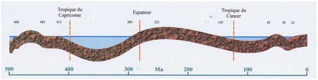 The wave motion of the brown band shows the altimetric variations of the future Belgium which during its drift during the last 500 million years (horizontal scale) underwent an alternation of continental phases and immersion in the sea at depths variables. It will be noted that this drift has led us from latitudes of the southern hemisphere through the intertropical regions so far N50 °.