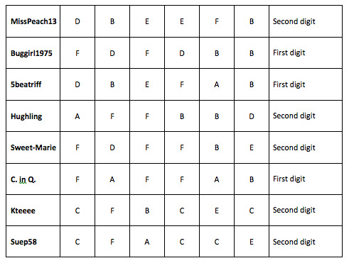 Clueless in Qualicum was 1st: 5beatriff was 2nd; Buggirl1975 was 3rd; Suep58 was 4th; Kteeeee was 5th; MissPeach13 was 6th; Sweet-Marie was 7th and Hughling was last.