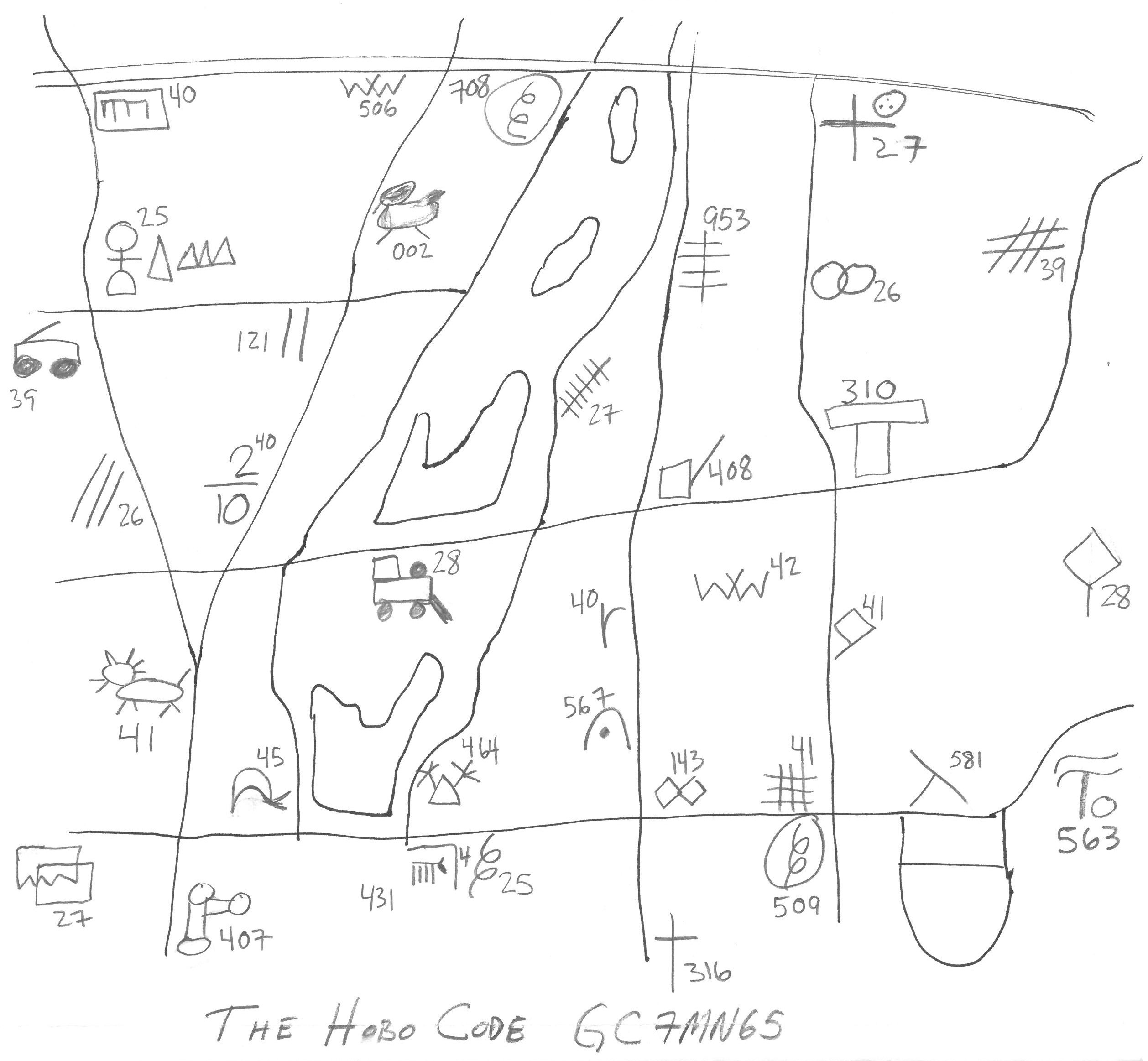 There’s a certain peacefulness to padding the hoof. As long as you stay out the big house, avoid the bulls and bone polishers and boil up when needed, you’d be alright. In the late 1800s and thru the first half of the 1900s, Hobos developed a way to communicate to one another by carving or drawing symbols on trees, post, bridges and houses. The symbols would offer directional guidance and/or warnings of what was ahead. This became known as the Hobo Code. Carry the banner, know the Hobo Code and you won’t catch the Westbound – that’s what I always said!