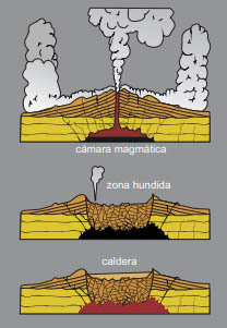 Pero ¿qué es una caldera volcánica y cómo se forma? Se trata de un cráter de grandes dimensiones formado por el hundimiento del terreno en la erupción de un volcán. Este hecho se produce cuando las emisiones volcánicas son muy grandes y explosivas, lanzando decenas de toneladas de magma a la superficie terrestre. Al extraerse un volumen tan grande de magma de una cámara magmática, el terreno se colapsa formando una enorme depresión que es lo que llamamos caldera. En ocasiones, tras la formación de una caldera, la cámara magmática recibe nuevos aportes desde zoñas más profundas y el interior de la caldera se puede volver a elevar, en un fenómeno que se llama resurgencia.