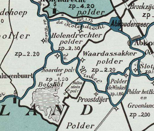 In deze omgeving lagen op een gegeven moment vijf polders, te weten: de Holendrechter -, Kievietsheuvelsche - , Aessacker - , Achterdorp – en Slotpolder. De eerste poldermolens verschenen aan het eind van de 14e, begin 15e eeuw. Ze waren net op tijd. Doordat de moeraslandjes waren ontgonnen en er slootjes waren gegraven, was de veenbodem gaan inklinken en daardoor gaan zakken.