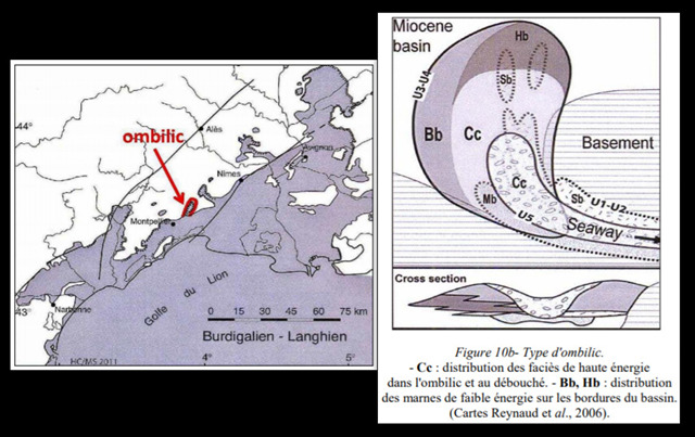 Vers –30 Ma, une véritable inversion de tendance se manifeste dans la région, elle subit des effondrements en relation avec l'ouverture de la Méditerranée occidentale mais la partie sud du massif Central (Montagne Noire, Cévennes) se relève. C'est dans cette mer, très peu profonde et chaude, ancêtre de notre Méditerranée actuelle, qui envahit au Miocène les gradins les plus bas des effondrements de la plaine littorale jusqu'aux premiers contreforts des garrigues que se déposent des sables, argiles et surtout des calcaires bioclastiques très riches en fragments de coquilles. Ces dépôts marins ont formés les calcaires coquilliers que nous avons découverts et qui sont connus géologiquement sous le nom de « molasse burdigalienne». Ils sont discordants sur les terrains plus anciens. Ils ont été déposés sous forme d'inondations graduelles (on-lap) sur les paléoreliefs où ils constituent des dépôts grossiers de haute énergie contrôlés par la marée. Le littoral était alors caractérisé par des îles de calcaire (Jurassique ou Néocomien) et des baies profondes quasiment fermées, communiquant par des ombilics à la mer dans lesquels les courants de marée s'accélèrent, avant de décroître dans la baie et de déposer le matériel