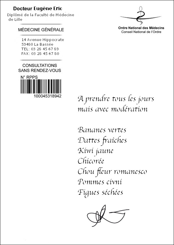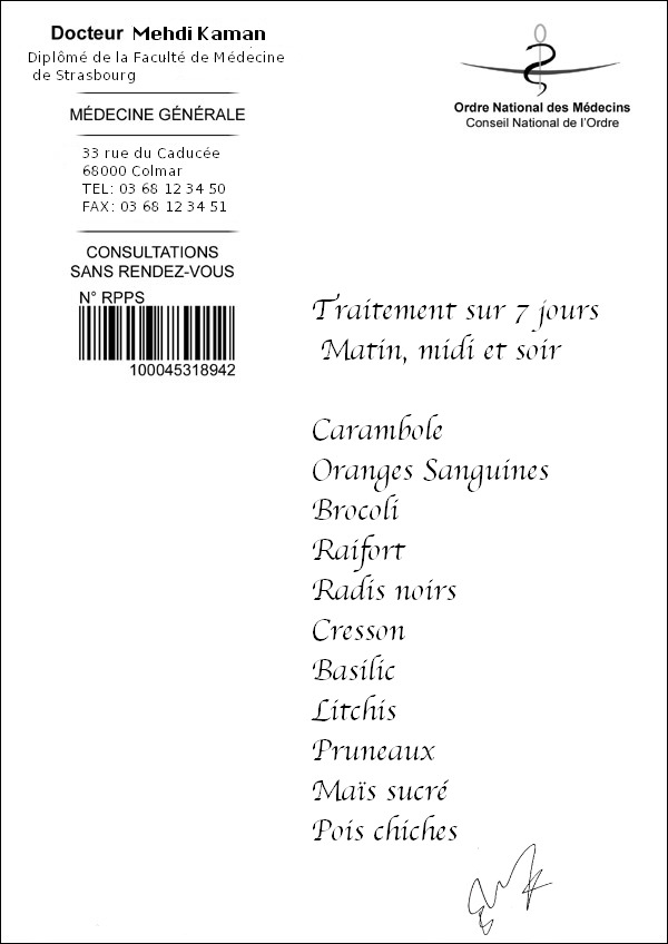 Dans son désir de guérir de carences nutritionnelles et de suivre aussi les recommandations du Programme National Nutrition Santé qui préconisent de manger 5 fruits et légumes par jour, un patient consulte 2 praticiens différents. Chacun lui donne une ordonnance dont vous trouvez copie plus bas.