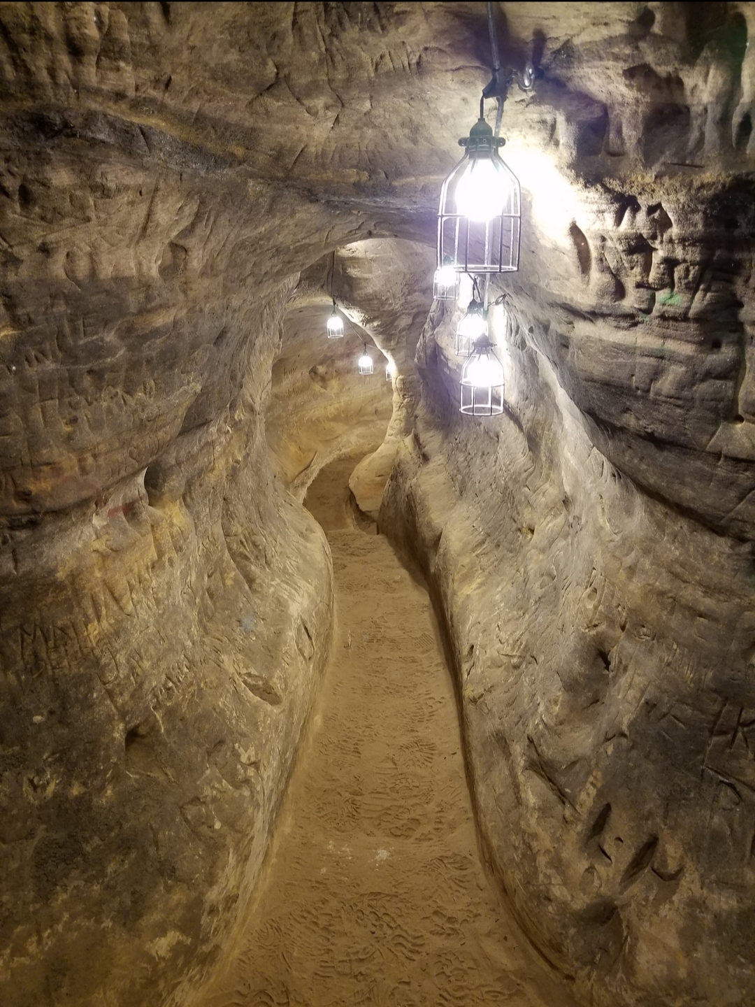 Early photos showed that there used to be a cliff on the west end where flood waters from the nearby Salt Creek & Beal Slough Rivers would flood to help create this cave, now evidenced by water lines. There were 3 entrances in the cliff, but only one was natural. Unfortunately, the cliff was accidentally destroyed by a quarry. The majority of this cave was hand-carved from that one natural opening prior to the 1870s, exposing many interesting sandstone layers inside. Iron ore and limonite are responsible for some of the color variances, especially visible in tunnel 2.
