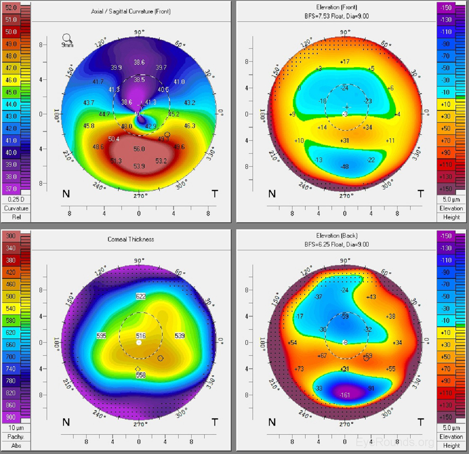 When the optometrist suspect that keratoconus might be present, they refer the patient to the ophthalmologist. A corneal topography is performed, which is a colormap of the surface of the cornea.