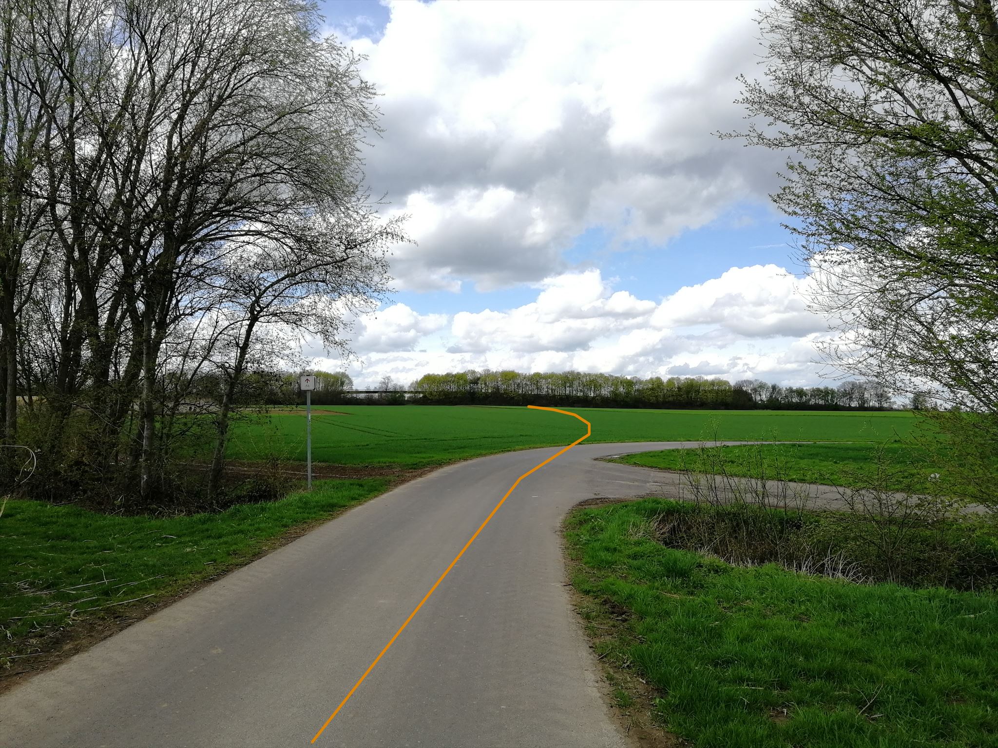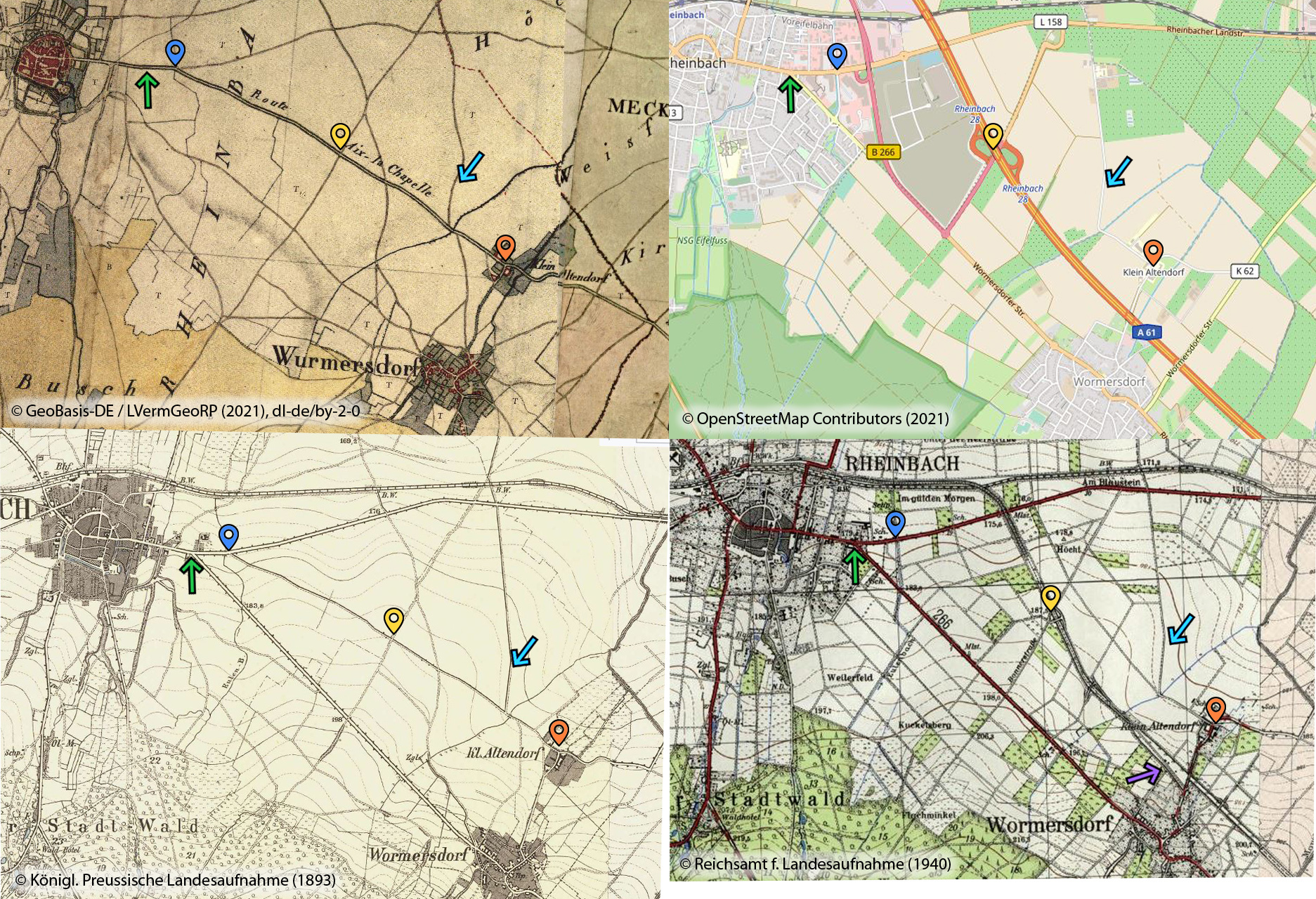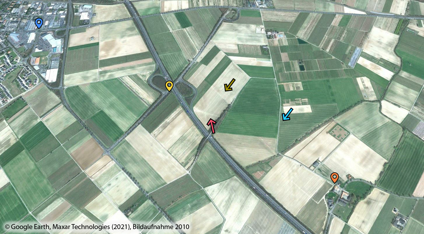 Hier an der Baumreihe verschwindet heute die AFH, die geradewegs durch die heutige Autobahnanschlussstelle (gelber Marker) und einen großen Baumarkt nach Rheinbach verlief und dort am heutigen Kreisel (blauer Marker) Richtung Rheinbach abbog. Halbrechts biegt der Wirtschaftsweg zum anderen Teil des Campus Klein Altendorf, früher war dies nur ein Zubringerweg zur AFH (blauer Pfeil). Sehr schön sieht man das Ganze auf dem Kartenvergleich von AFH, Karten von 1893 und 1940 und heutiger OSM. Geradeaus verlief ebenfalls eine Straße, die auf die Verbindung Rheinbach-Meckenheim traf und parallel zum Bahndamm der Unvollendeten verlief, der 1940 noch mit "Radfernweg" markiert war und in den 1960ern und 70ern mit der heutigen A61 überbaut wurde.