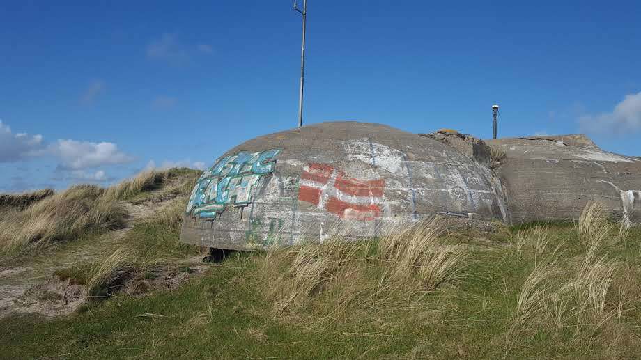 Længere henne ad stien finder hun den næste bunker. Den har en rampe, som lokker hende til at klatre op på taget. Her, på N55 26.937 E008 21.297 ser hun to 5-cifrede tal (C og D).