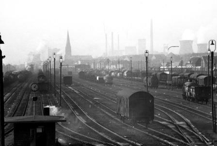 Hier siehst du den Rangierbahnhof Osterfeld-Süd. Er wurde 1891 von der Königlich-Preußischen Eisenbahn gebaut. Auf dem Rangierbahnhof wurden Eisenbahnwaggons mit Kohle, Erz, Stahl und vielen anderen Gütern zu Zügen zusammengestellt. Der Bahnhof Osterfeld-Süd war der zentrale Umschlagplatz für das gesamte Ruhrgebiet. Anfang des 20. Jahrhunderts war Osterfeld-Süd sogar der größte Bahnhof im europäischen Güterverkehr.
