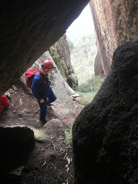 Reaching the cache will have you scramble, crawl, climb and abseil your way through this boulder infill ravine known as Burston’s Crevasse, some 400 metres long and descending about 150 metres into the Mount Buffalo Gorge. At the end of it you will abseil down into the Armageddon Cave.