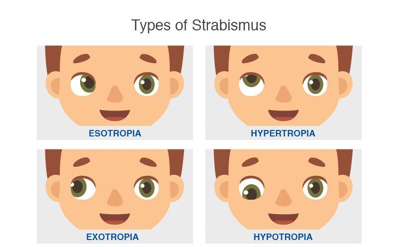 Strabismus can occur due to muscle dysfunction, farsightedness, problems in the brain, trauma, or infections. Risk factors include premature birth, cerebral palsy, and a family history of the condition. Types include esotropia where the eyes are crossed; exotropia where the eyes diverge; and hypertropia where they are vertically misaligned. They can also be classified by whether the problem is present in all directions a person looks (comitant) or varies by direction (incomitant). Diagnosis may be made by observing the light reflecting from the person's eyes and finding that it is not centered on the pupil. Another condition that produces similar symptoms is a cranial nerve disease.