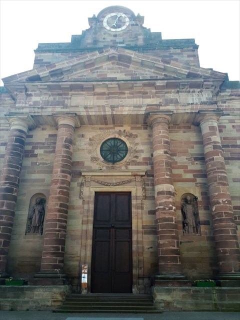 Construite à l’emplacement d’une église primitive de style roman datant du XII ème siècle, son imposante façade à colonnes doriques inspirée des temples de l’Antiquité gréco-romaine, accueille également les statues de Sainte Odile et Saint Arbogast. Seul l’ancien chœur surmonté d’une tour et datant de cette époque a été conservé.