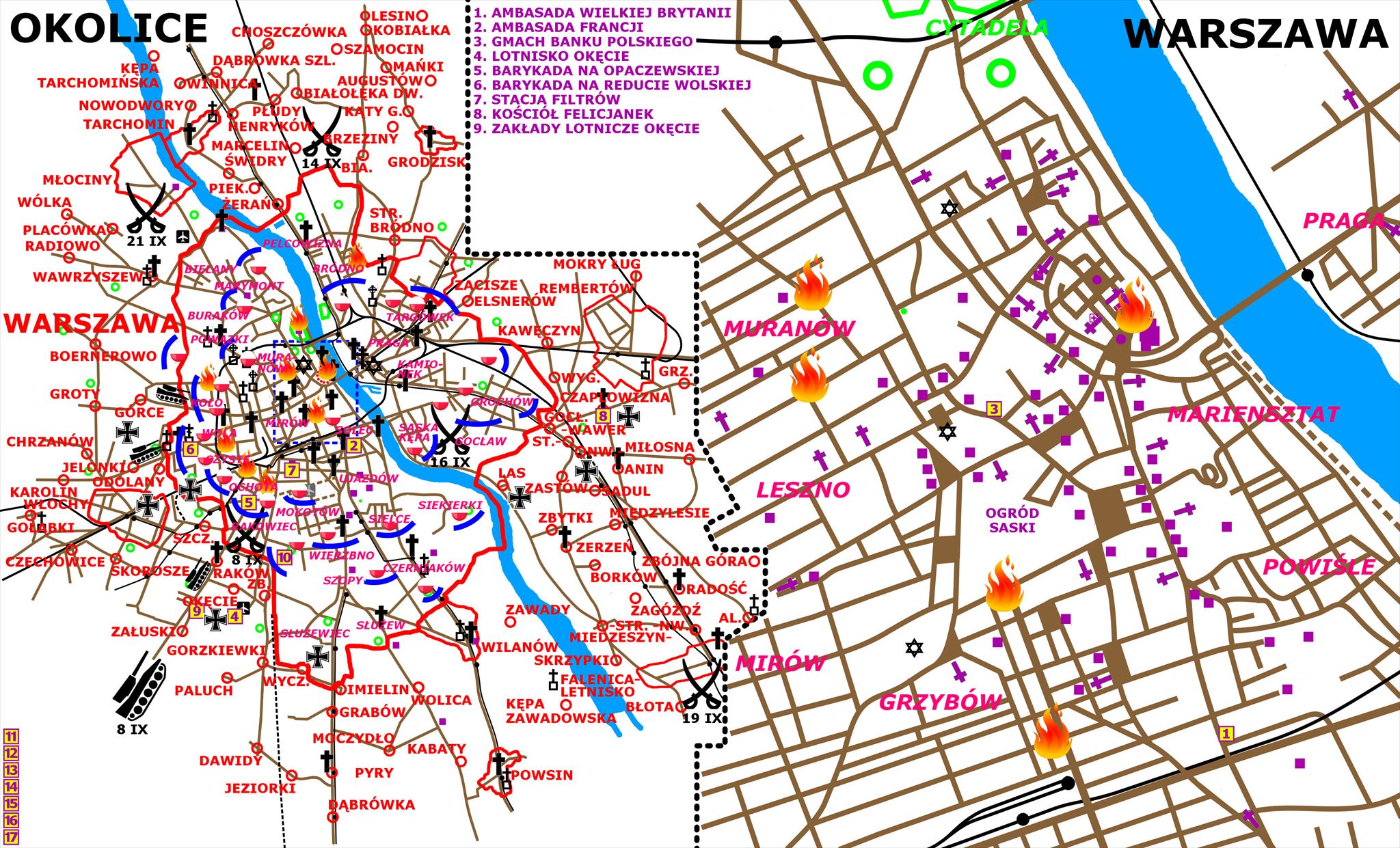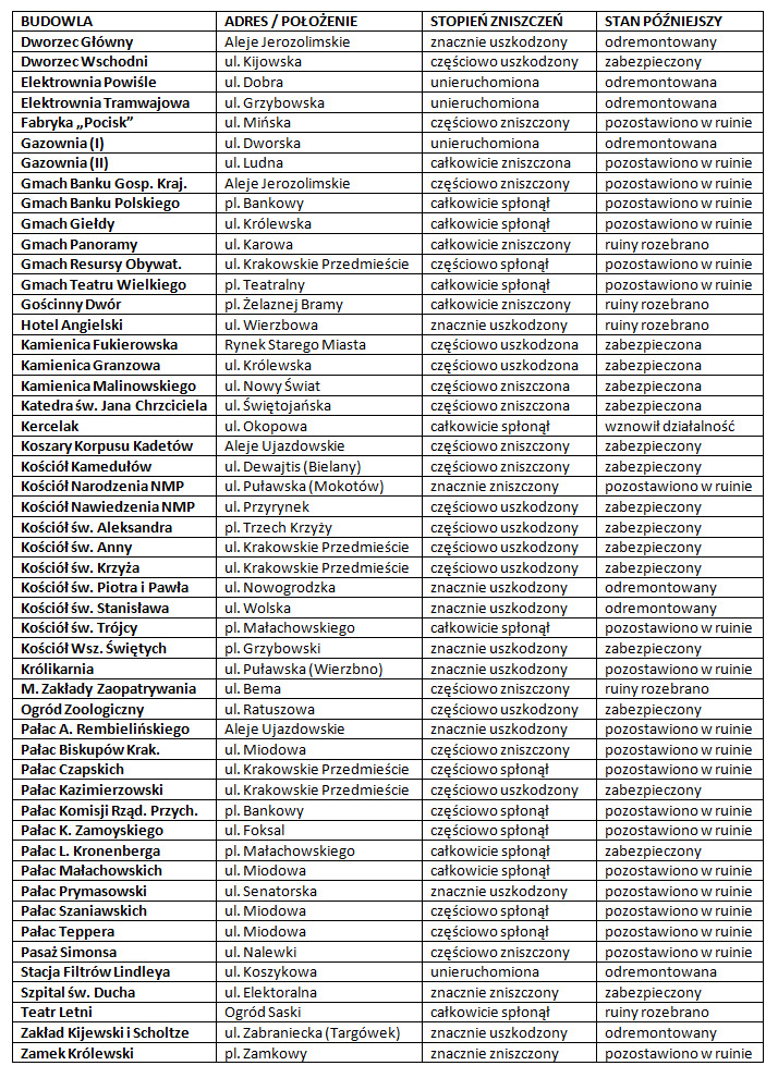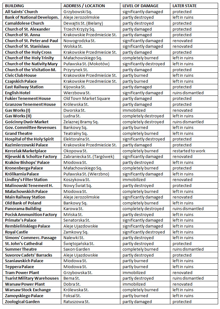 !] W zaledwie kilkanaście dni września 1939 roku niemieckie bombardowania znacząco uszkodziły lub zniszczyły około 15% zabudowy miasta, w tym wiele obiektów o znaczeniu historycznym, kulturalnym bądź zabytkowym. Agresorom chodziło nie tylko o pokonanie wroga i zajęcie jego terytorium, ale także spowodowanie znaczących szkód w jego dorobku kulturalnym. To nie jest pytanie. Warto jednak zapoznać się z poniższą listą. Wymienia ona większość obiektów, wymienionych w poprzednich częściach "Story of Warsaw", które we wrześniu 1939 roku uległy znacznym zniszczeniom.