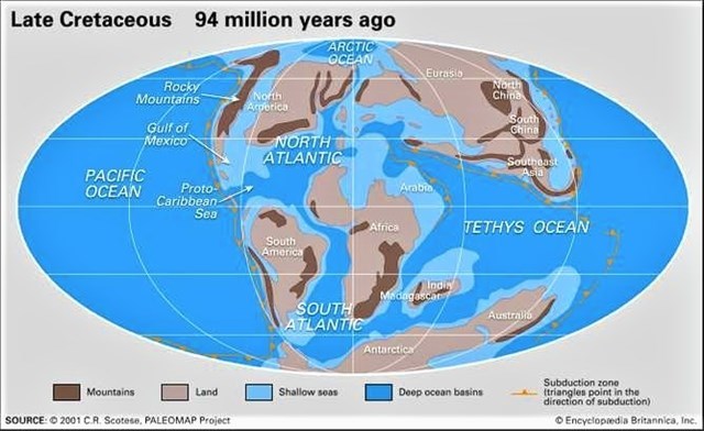 El alto nivel del mar y el clima cálido del Cretácico significaron que grandes áreas de los continentes estaban cubiertas por mares cálidos y poco profundos, proporcionando un hábitat para muchos organismos marinos. El Cretáceo recibió su nombre por los extensos depósitos de caliza de esta época en Europa, pero en muchas partes del mundo, los depósitos del Cretáceo son de piedra caliza marina, un tipo de roca que se forma en condiciones marinas cálidas y poco profundas. Debido al alto nivel del mar, había un amplio espacio para tal sedimentación. Debido a la edad relativamente joven y al gran espesor del sistema, las rocas del Cretácico son evidentes en muchas áreas en todo el mundo.