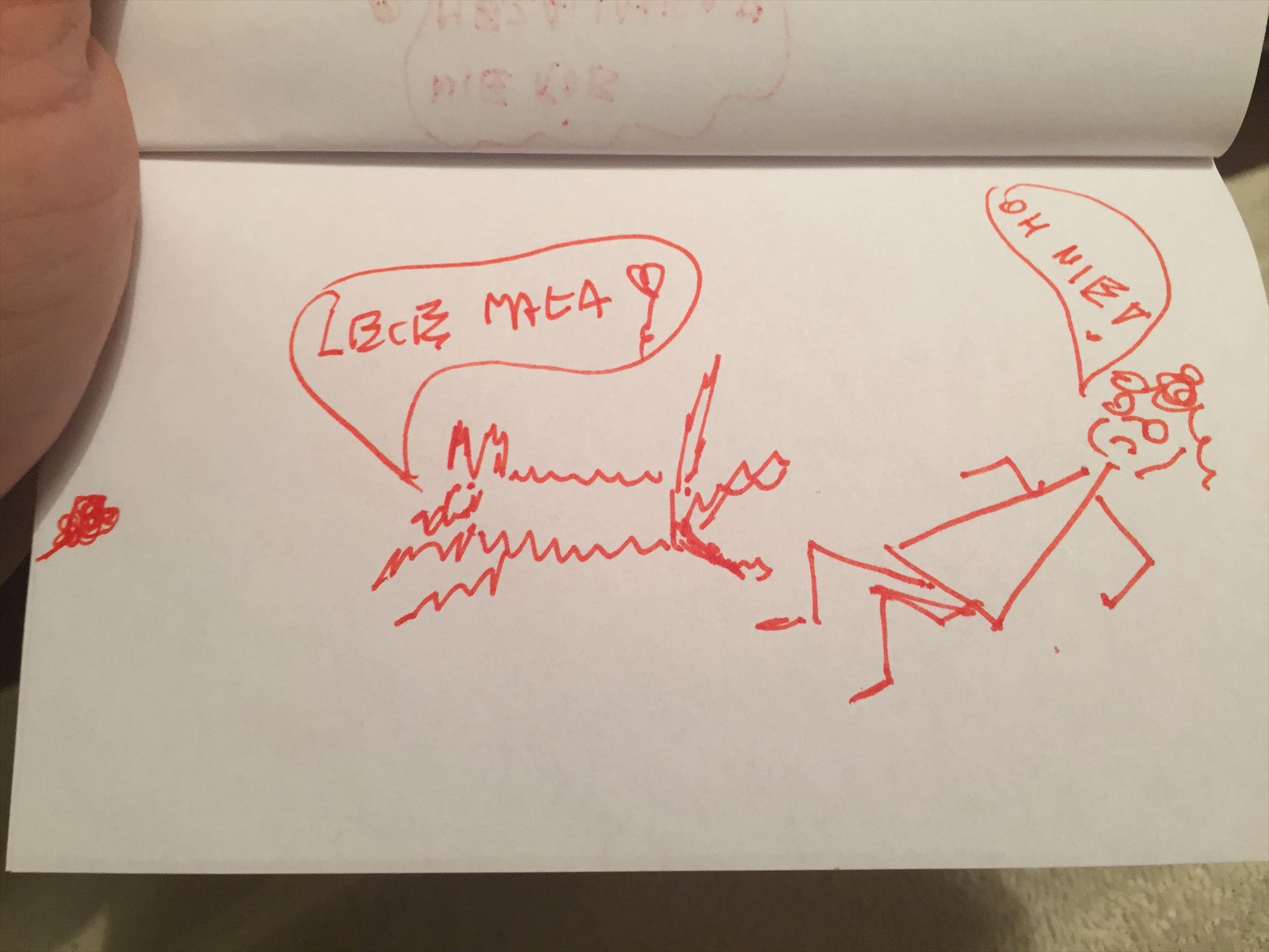 Jak to jej pani zauważyła, to Pusi zakazała na Burka się oglądać i się nie skundlać. I że … jakby co się zdarzyło, to by ona tego nie przeżyła. I na wszelki wypadek Pusię na ręce wzięła i w te pędy od nas oddalać się zaczęła.