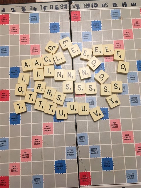 Le premier mot posé touchait l'étoile (case rose= mot compte double). Les primes de lettres (cases bleu clair = *2 / bleu foncé= *3) et mots (cases roses= *2 / rouge= *3) ne comptent que dans leur premier placement.Quand l'un des joueur réussit à placer ses 7 jetons-lettres dans le même tour, cela ajoute 50 points à son compte/tour. Voici les lettres mélangées par le coup de vent: .A*2 / C*1 / D*1/ E*5 / F*1 / I*3 / L*1 / N*3 / O*4 / R*2 / S*6 / T*4 / U*3/ V*1 / X*1 ...et voici l'ordre des coups joués et les scores à chaque tour: