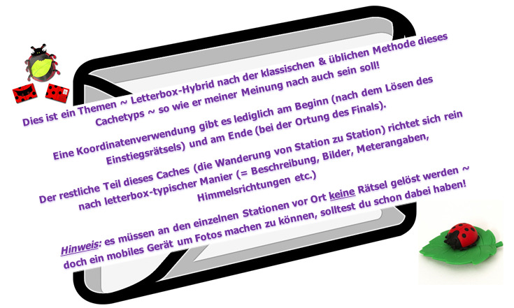 Hinweis: es müssen an den einzelnen Stationen vor Ort keine Rätsel gelöst werden ~ doch ein mobiles Gerät um Fotos machen zu können, solltest du schon dabei haben!