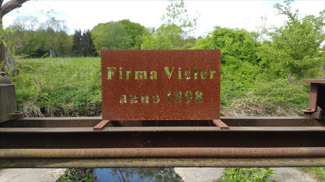 Eine Einladung zur Firma Vieler. Genaueres über den Ort habe ich noch nicht rausfinden können. Die Absperrvorrichtung an diesem kleinen Baarbachzufluss wurde vielleicht von der Firma Vieler gebaut? In jedem Fall ist das Erinnerungsschild deutlich jünger als das Originalbauwerk: