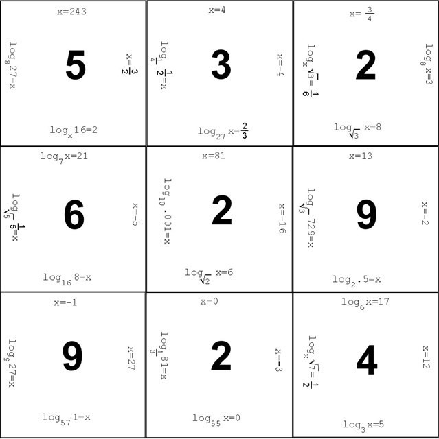 First arrange the squares in the following grid such that equivalent equations align along the touching edges. All bases are positive numbers. You can find a printable version in the gallery.