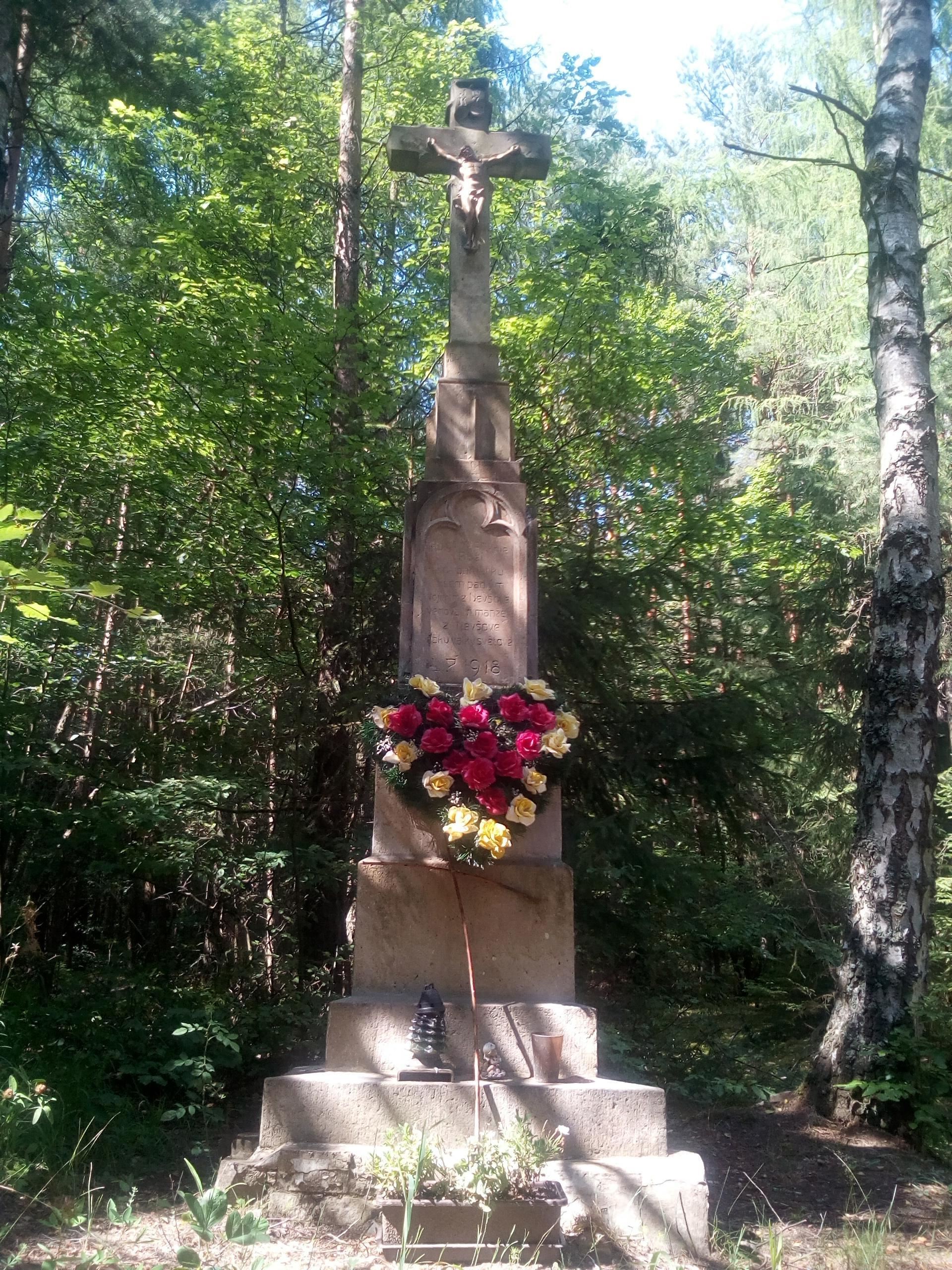 Z místní očásti Lukšín, kolem továrny na obuv Prabos, vede cesta ke známému Pivečkovu lesoparku. Odtud vede silnice, tzv. „Stará cesta “ do Nevšové. Směrem od Slavičína, asi 300 metrů od altánku dále po cestě, stojí kamenný kříž. Jak na něm vytesáno, je vystavěn „Ku cti a chvále Boží a na památku všem padlým vojínům z Nevšové věnovali manželé z Nevšové roku války světové L.P. 1918.“