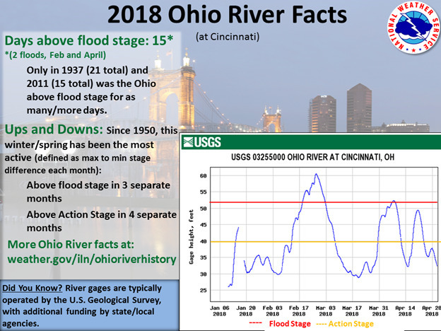 In 2018, Cincinnati experienced significant flooding of the Ohio River. Smale Riverfront Park, which lies across the river from where you stand, was submerged in the floodwaters. The following graphic details Cincinnati’s 2018 flood event.