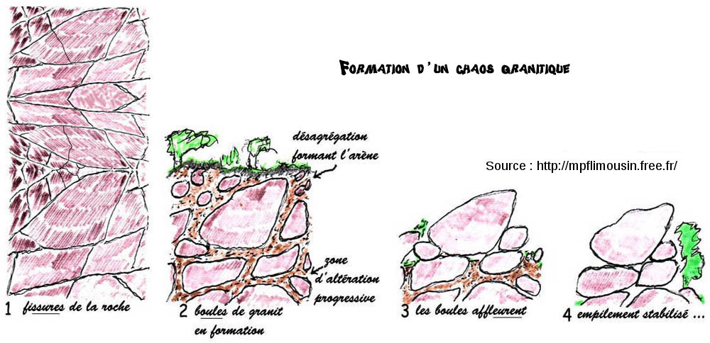 Les chaos granitiques sont le résultat de l'altération en boules des granites, boules qui sont dégagées par l'érosion