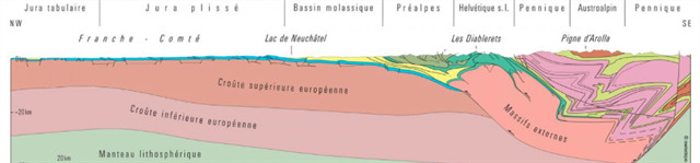 Les Alpes sont nées de la collision entre deux continents il y a environ 35 millions d’années. Le continent au nord correspond à l’Europe, celui du sud, parfois qualifié d’africain, est nommé plaque adriatique et correspond en partie à l’Italie actuelle. Entre ces continents se trouvait un océan qui comprenait une série de roches caractéristiques de la croûte océanique, à savoir des basaltes et autres roches magmatiques basiques ainsi que des sédiments que l’on nomme des radiolarites. Ces roches typiques des océans qui se trouvent coincées dans les chaînes de montagnes sont les ophiolites. Actuellement on retrouve de telles roches dans la région de Zermatt. Avant la formation de la chaîne des Alpes il y a 35 millions d’années, durant le Mésozoïque et le Cénozoïque (dès 250 millions d’années), les deux marges continentales étaient recouvertes périodiquement d’une mer au fond de laquelle se sont déposés des sédiments (calcaires, grès, …). Ces sédiments reposaient sur un soubassement formé de gneiss et de granites anciens, que l’on nomme socle et qui renferment les traces laissées par une ancienne chaîne de montagne de la fin du Paléozoïque : la chaîne hercynienne. Le continent européen qui s’est enfoncé partiellement sous le continent Adriatique a été fortement déformé et de vastes portions de la croûte terrestre ont été transportées sur des distances considérables, probablement sur 100 km ou plus. Ces éléments transportés s’appellent des nappes tectoniques et sont visibles sur les coupes au travers de la Suisse. Le Jura est la nappe tectonique la plus jeune et la plus externe (septentrionale).