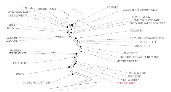 Ce parcours est organisé depuis le bâtiment Géopolis vers la station de métro « Mouline » soit (à l’exception du granite du Mt Blanc) des zones externes des Alpes (Jura) vers les zones plus internes du massif.